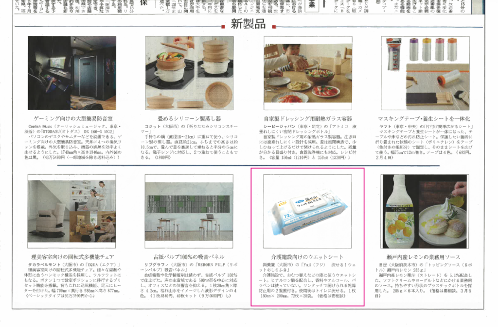 日経新聞(日経MJ)に新商品「フジ流せるウェットおしりふき 」 が掲載されました。 2026年1月28日 最終更新日時 : 2026年1月28日 Fuji-Shobido 2026年1月28日(水)の日経新聞(日経MJ)に新商品の「フジ流せるウェットおしりふき 」が掲載されました。