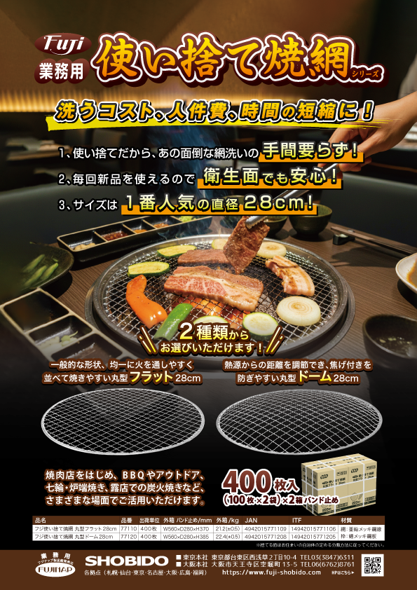 焼き網 2026年3月17日 最終更新日時 : 2026年3月23日 Fuji-Shobido カテゴリートップへ 新商品更新情報 焼き網 使い捨て焼網 洗うコスト、人件費、時間の短縮に!焼肉店をはじめ、BBQやアウトドア、七輪・炉端焼き、露店での炭火焼きなど、さまざまな場面でご活用いただけます。